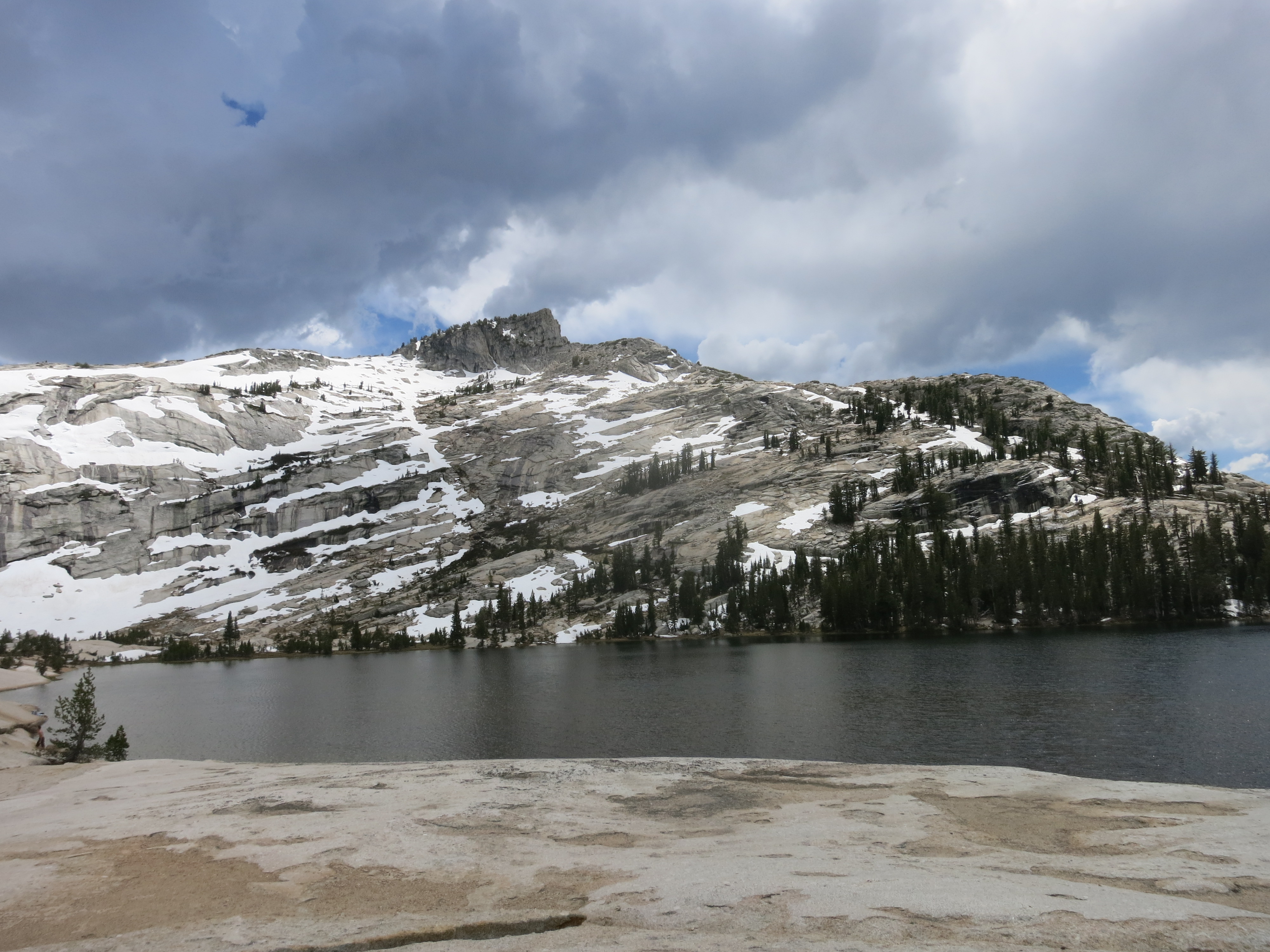 The first half mile of the trail I enjoyed stepping through the snow until the snow grew softer and slippery leading to unsure foot placement and several nearly twisted ankles. As we approached Vogelsang I breathed a sigh of relief in the assumption the worst was behind us. But as we passed the now closed High Sierra Camp and got a view of the trail over the pass towards Bernice Lake, my anxiety returned as dark clouds and thunder once again loomed in the distance. Had the slush-like snow and the threat of rain and lightning not been present, I would have loved to relax and eat some lunch while taking in the gorgeous view of Vogelsang Lake.
