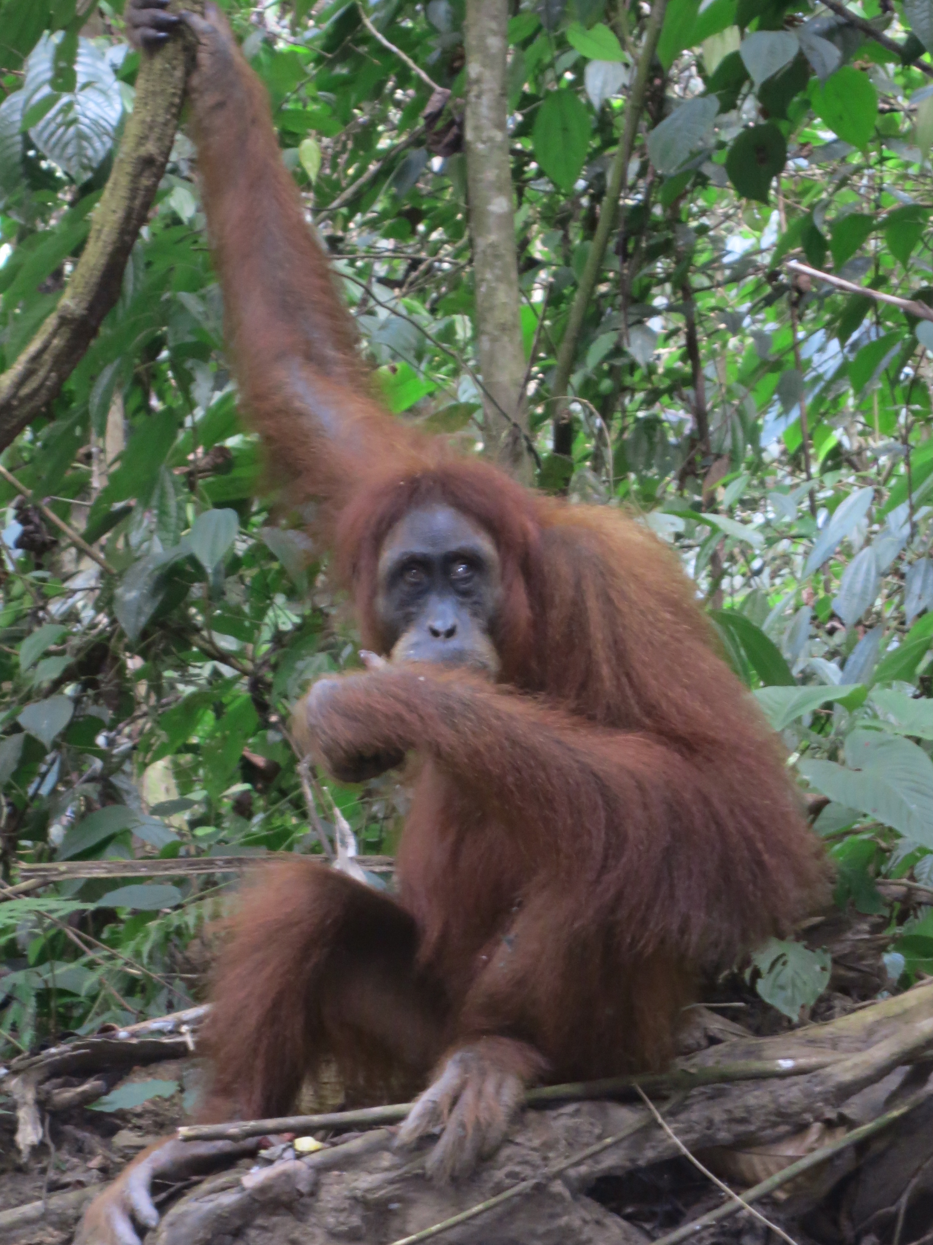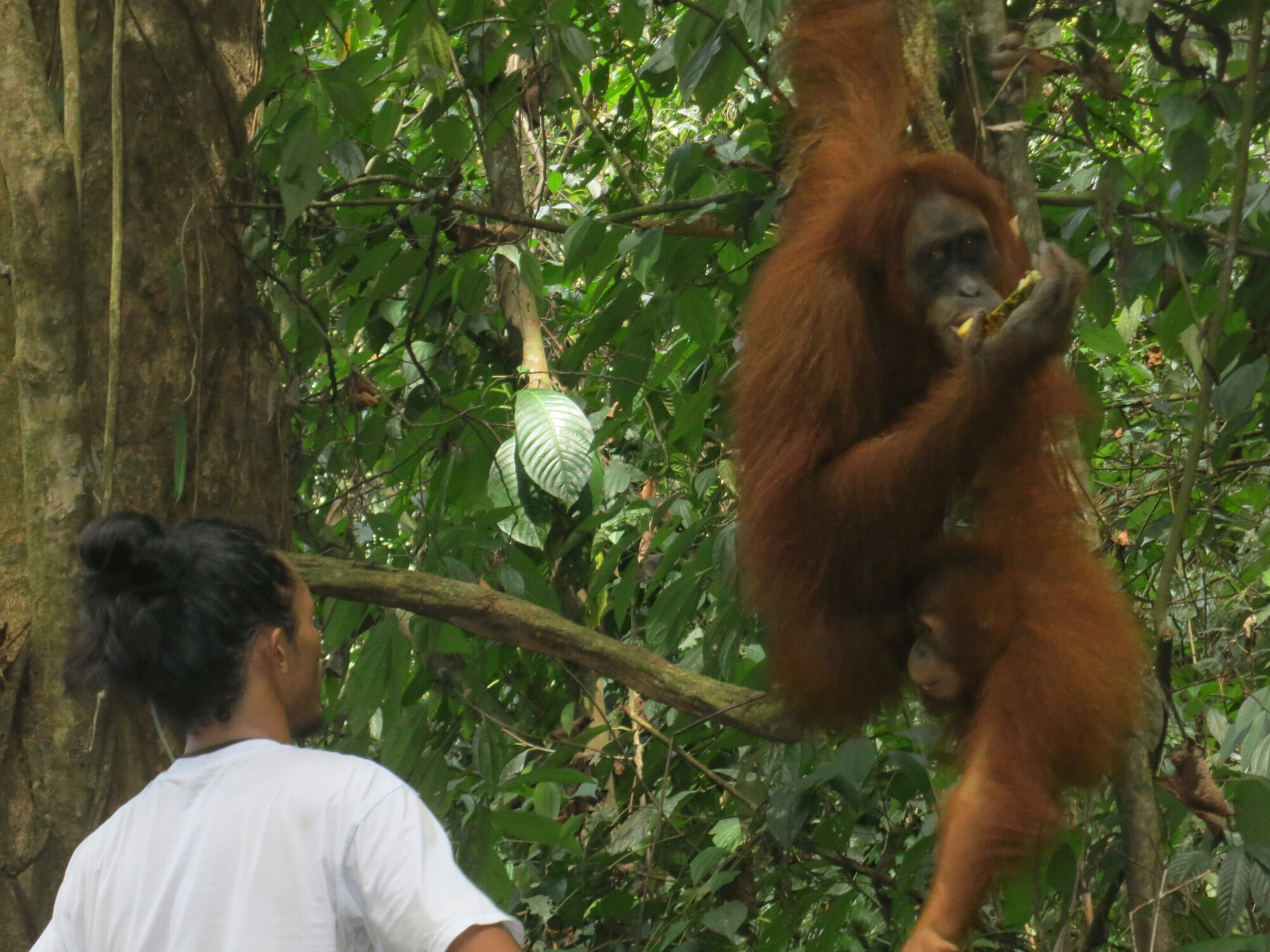 Although I’m not quite sure what we paid €90 each for, I am thankful to have seen the Orangutans up close, which in itself brings up a moral dilemma. We saw Orangutans on four different occasions throughout the trek, sometimes we were within 15 feet of the loveable red-coated creatures. Jackie a semi-wild female was so human-like as she reached for the pineapple a guide handed her and her adorable little baby as he stood directly next to her, basically touching her. Instead of viewing Orangutans from afar, the neglectful guides lure them down with pieces of fruit while chain smoking so that the eager tourists can get their photographs. How can I judge? I stood there awe struck at the kind eyes of these gentle animals, furiously snapping the photos below.